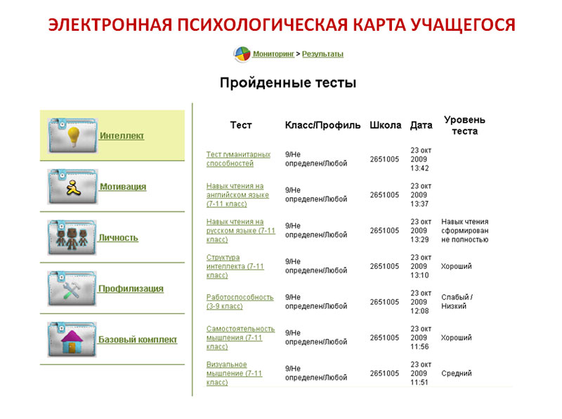 Все результаты пройденных тестов попадают в персональную электронную психологическую карту, где распределяются по соответствующим папкам: «Интеллект», «Мотивация», «Личность», «Профилизация», «Базовый комплект».