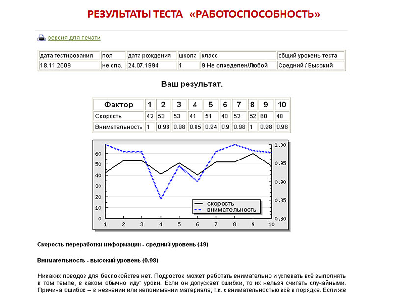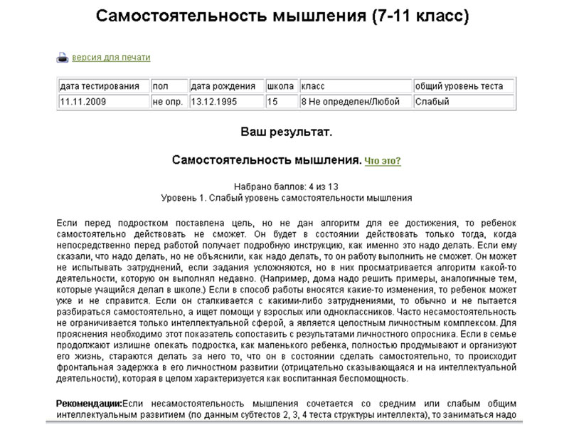 В описании результата по любому отдельному тесту или целому комплекту присутствует кнопка «Версия для печати», она позволяет выводить результаты на печать сразу с сайта. Персональная электронная карта позволяет отслеживать динамику развития всех показателей на протяжении всего периода обучения в школе (с 1-го по 11-й класс).